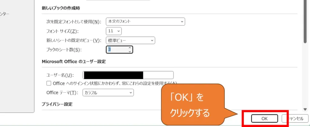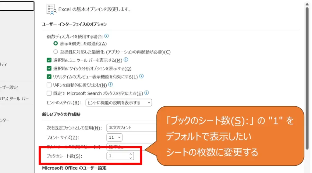 これで、新しいブックを作成するときに、設定したシート数が最初から反映されるようになります。