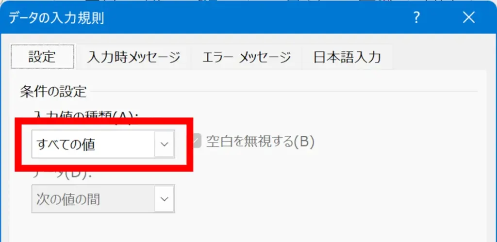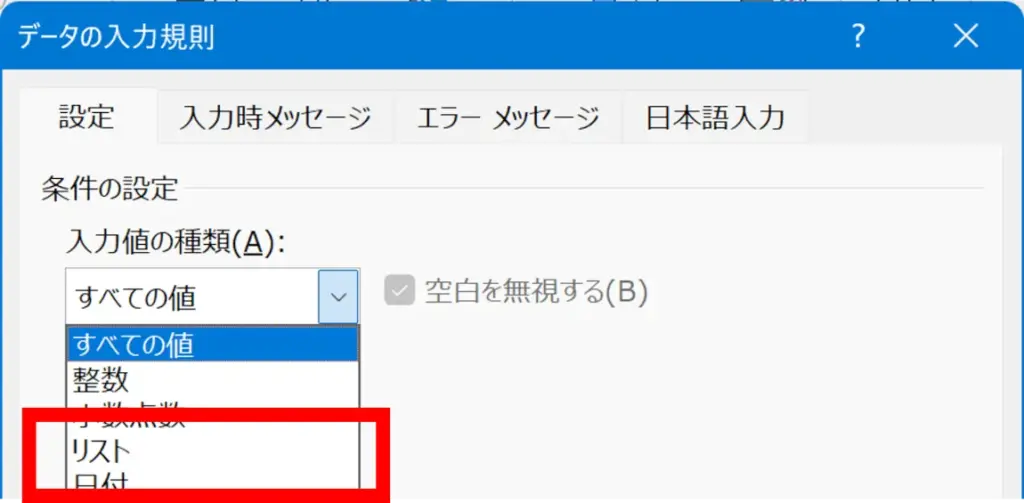 入力規則のリストは、Windowsの設定を変更しない限り、半角カンマ「,」を区切り文字として使用します。そのため、リストボックスの選択肢そのものにカンマを含めることは通常できません。