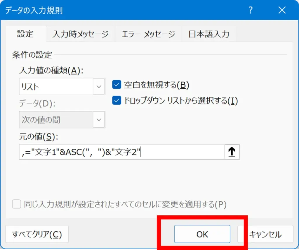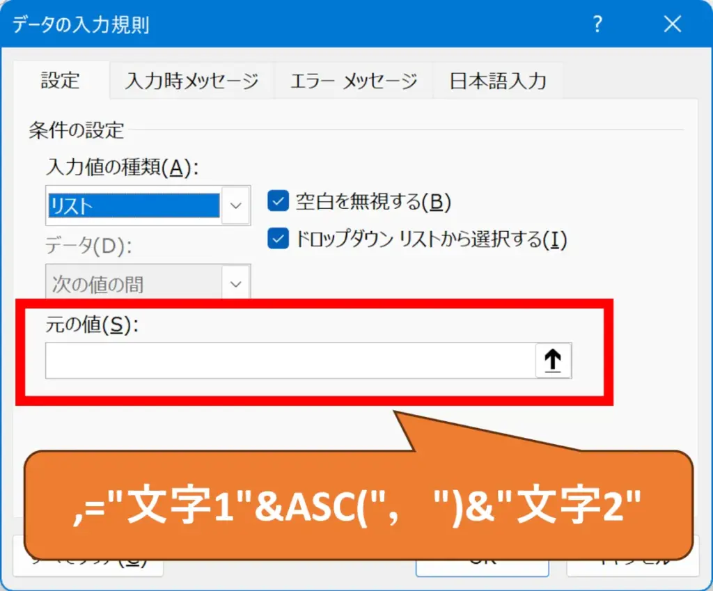 ”入力規則の元の値に「,=”文字1″&ASC(“,”)&”文字2″」と入力する” とお伝えしました。