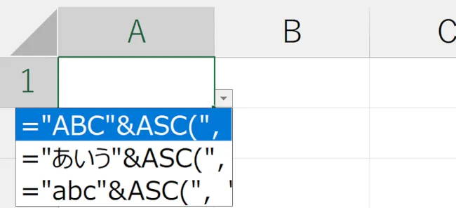 「,=”ABC”&ASC(“,”)&”DEF”,=”あいう”&ASC(“,”)&”えお”,=”abc”&ASC(“,”)&”def”」