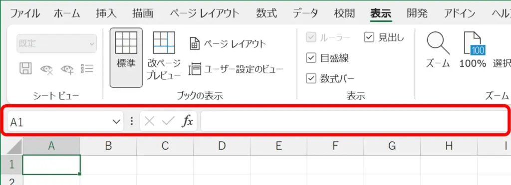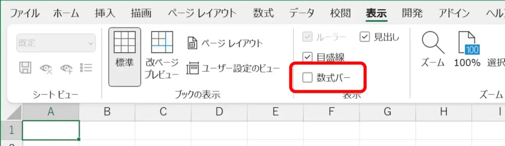 数式バーが消えた場合は、「表示」タブのチェックを入れるのが最も簡単です。