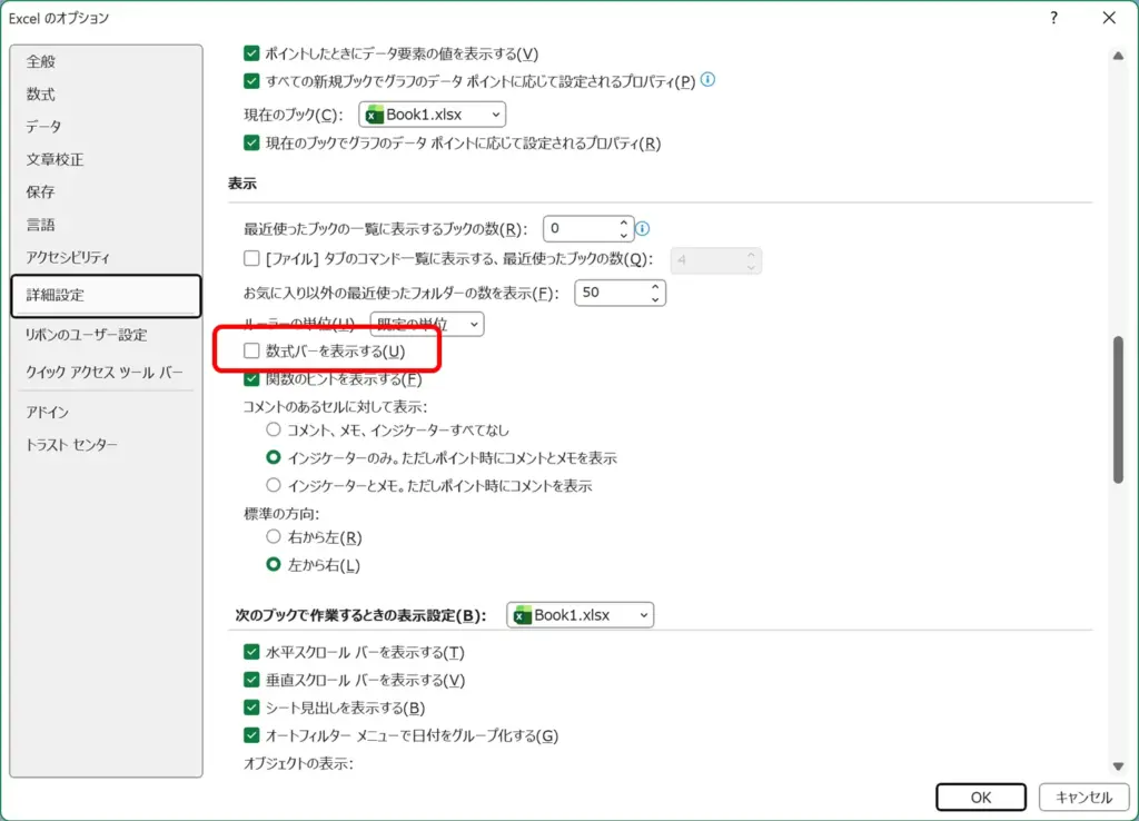 それでも直らない場合は、オプションから「数式バーを表示する」にチェックを入れてみましょう。