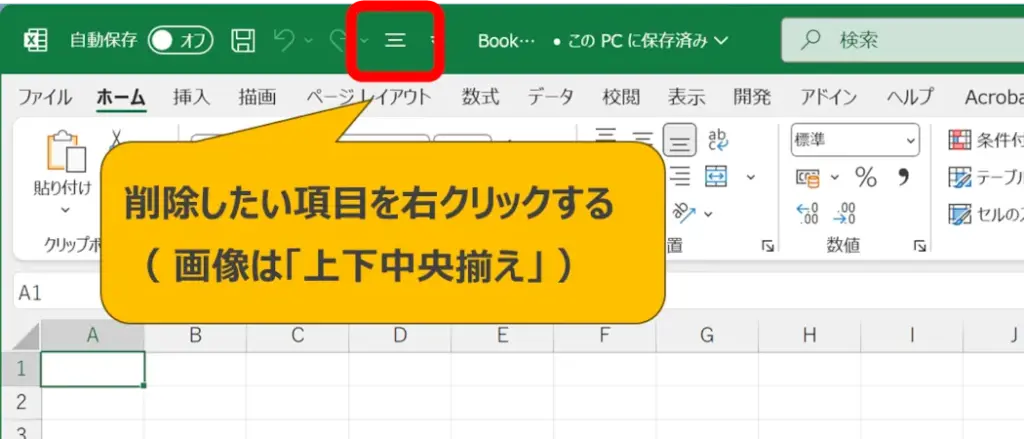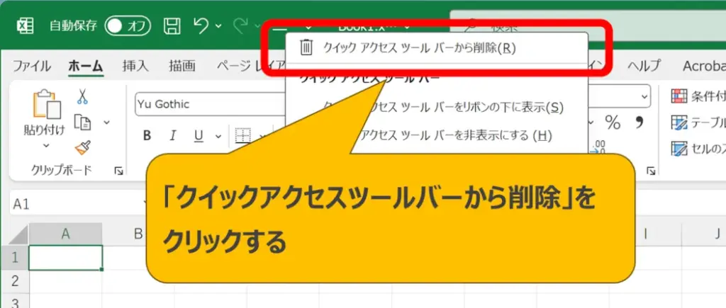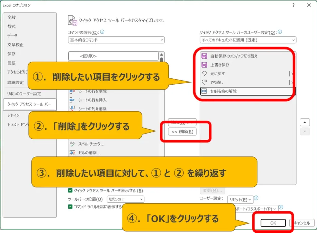 クイックアクセスツールバー削除したい項目を右クリックすることで、削除することができます。