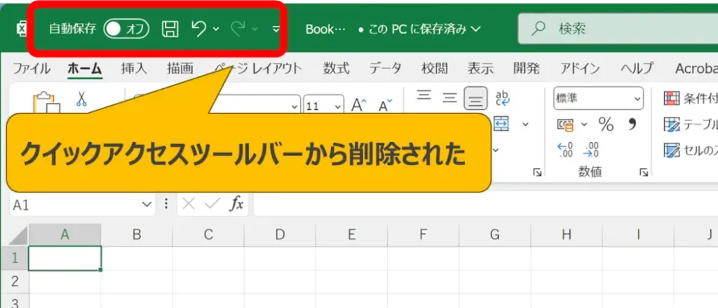 これは、リボンの上(設定によってはリボンの下)に表示されるバーで、よく使う操作を登録できる機能です。クイックアクセスツールバーはリボンの上もしくは下に表示され、それぞれ見た目が異なります。