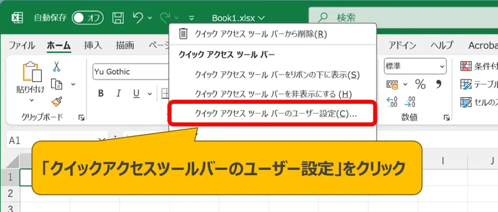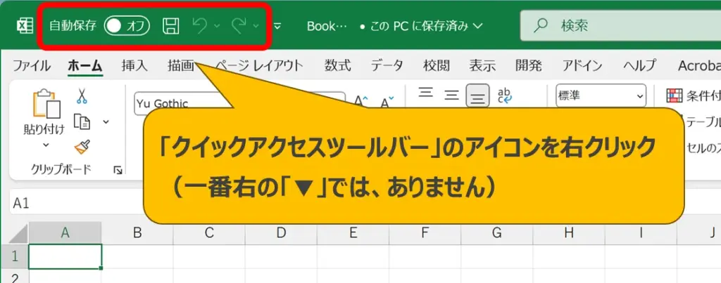 クイックアクセスツールバー上の任意のアイコンを右クリックします。