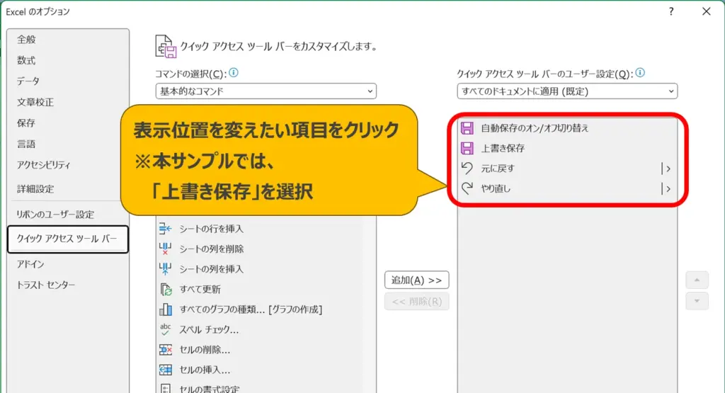 クイックアクセスツールバーのユーザー設定の列に現在表示されている項目があります。