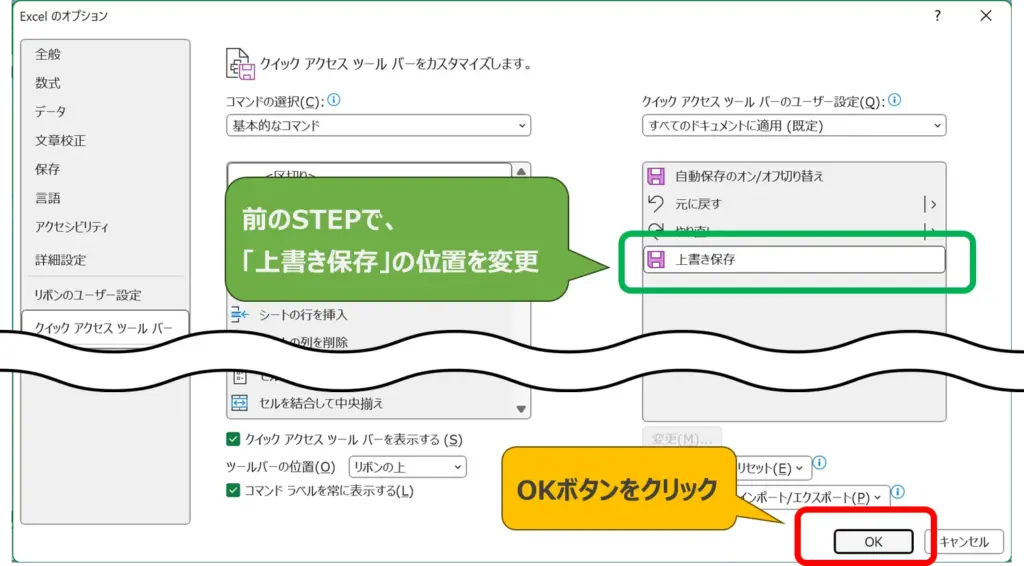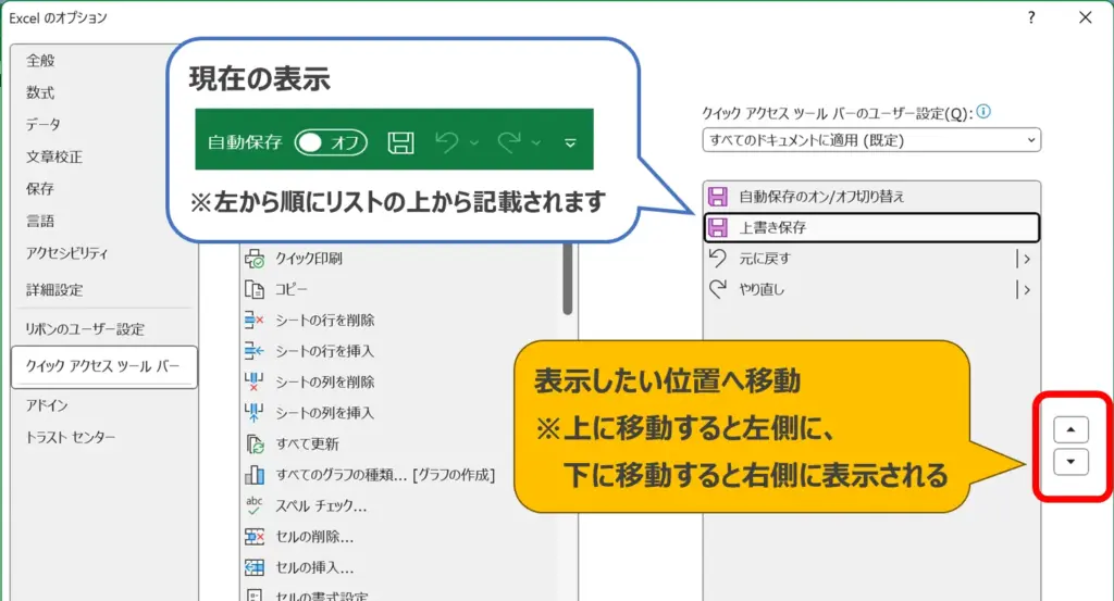 クイックアクセスツールバーは左から順に並ぶため、『上』を押すと左側、『下』を押すと右側に移動します。