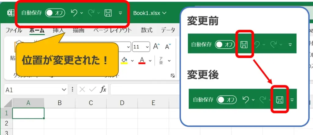 これで、クイックアクセスツールバーの並び替えが完了です。よく使う順に並べておくと作業がスムーズになります。