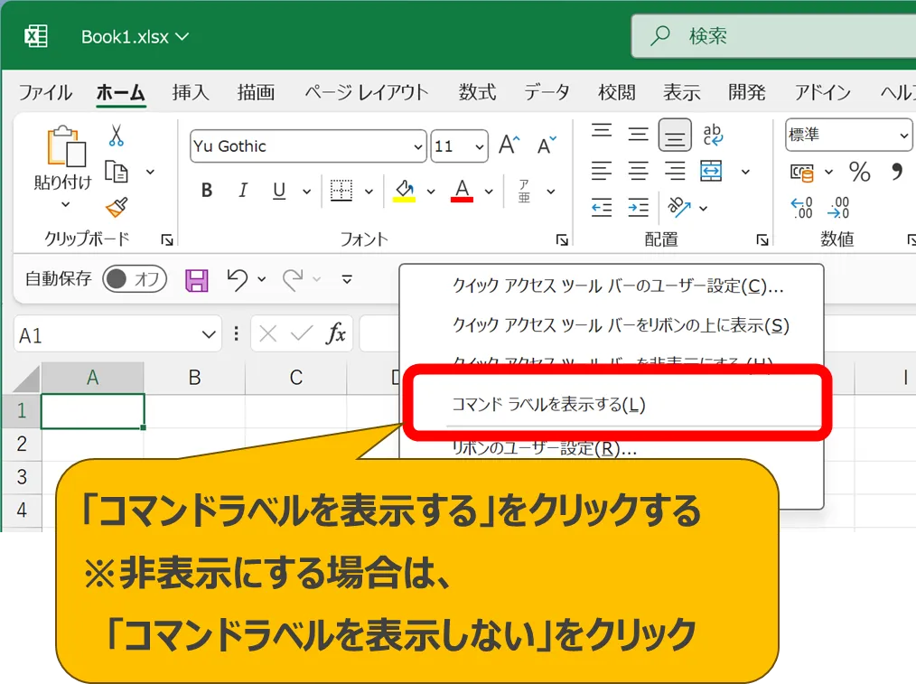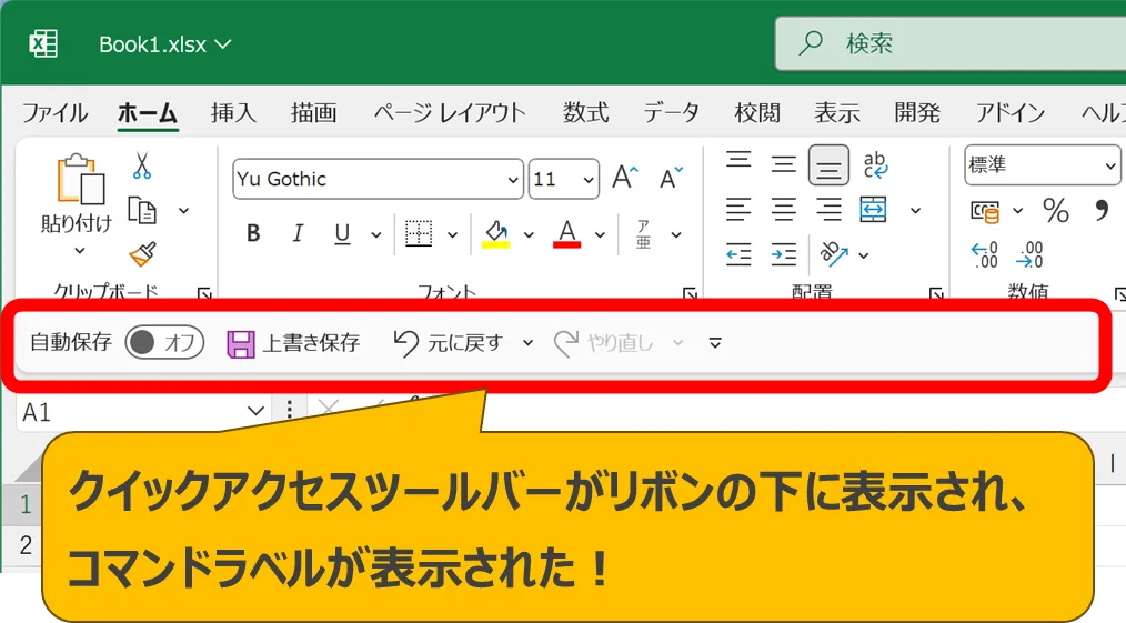 クイックアクセスツールバーのコマンドラベル(文字)を表示するには、クイックアクセスツールバーをリボンの下に配置する必要があります。ここでは、その移動手順を解説します。