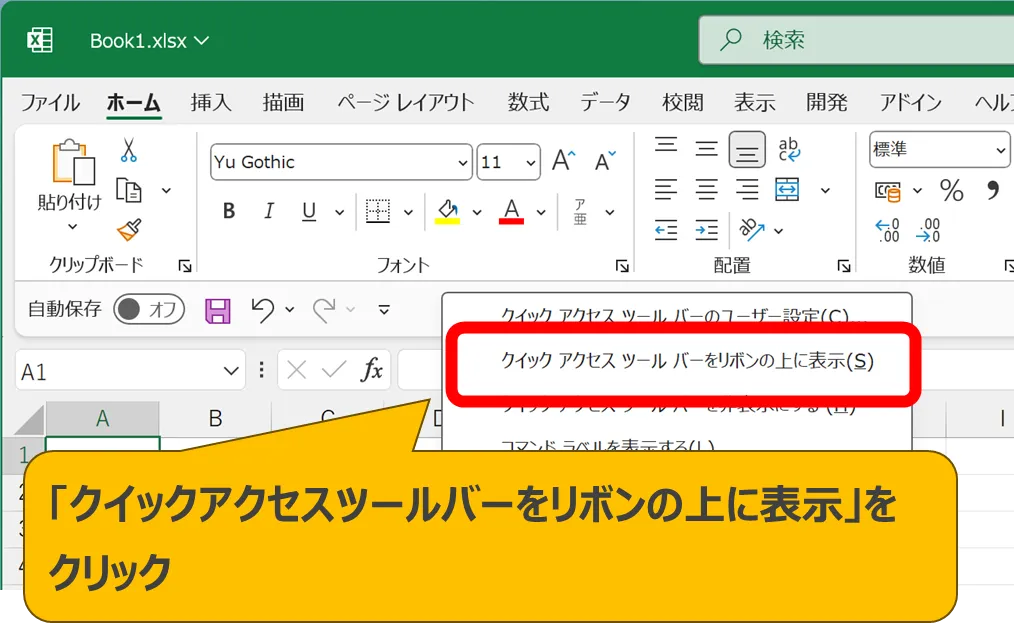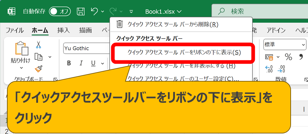 「クイックアクセスツールバーをリボンの上に表示」をクリックします。