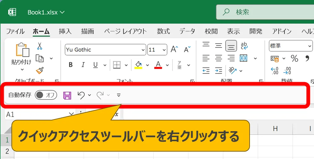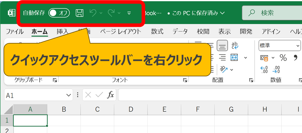 表示されていない場合は、まずクイックアクセスツールバーを表示させましょう。