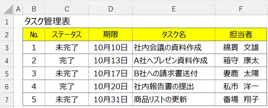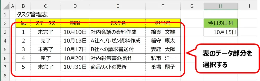 サンプルとして、下記の表を使います。C列のステータスが “完了” の行を全て、背景色を薄い緑色にします。
