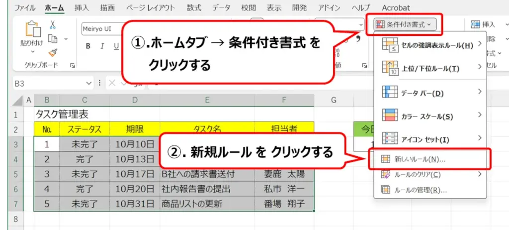 ホームタブにある「条件付き書式」→「新規ルール」をクリックします。
