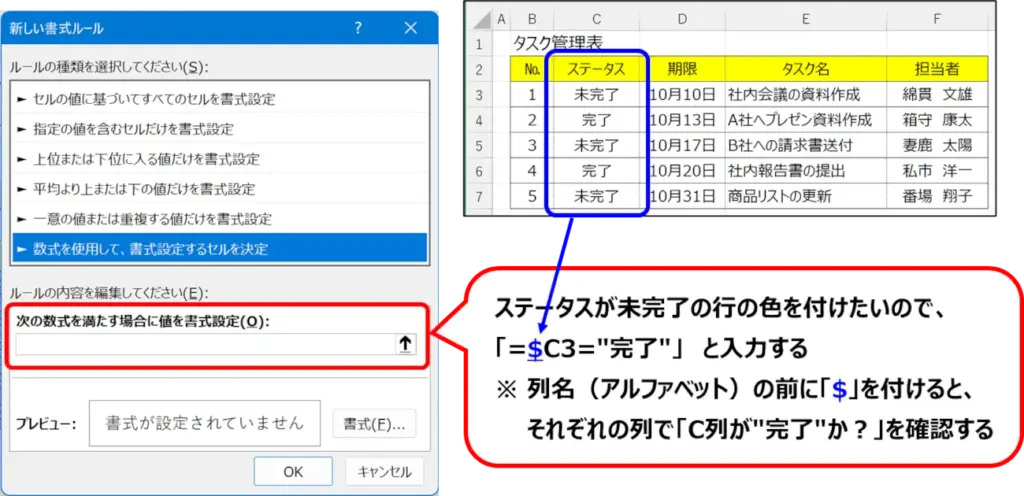 今回の例(下の画像)では、ステータスの列はC列、データの最初の行は3行目、”完了” になったら書式を変えるため、「=$C3=”完了”」となります。