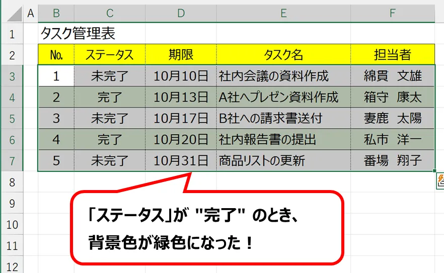 表のステータスの「完了」になったら、薄い緑色に変更するため、条件付き書式を使います。