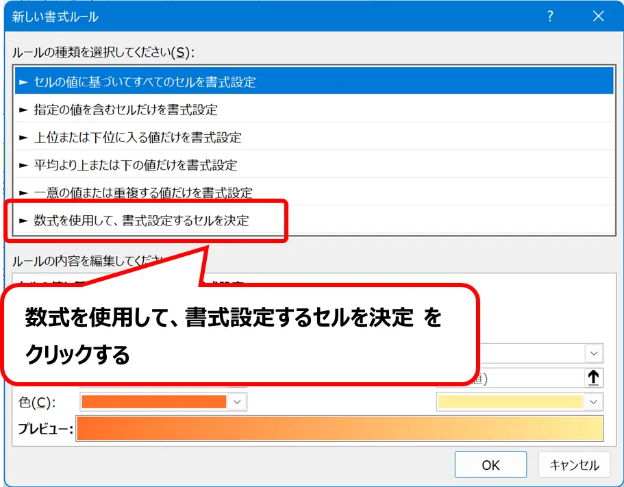 「数式を使用して、書式設定するセルを決定」をクリックする。