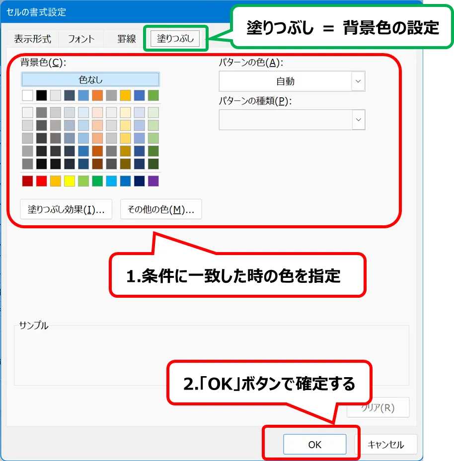 背景色を選択して、OKボタンで書式を確定する。