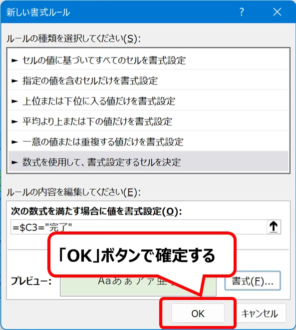 「OK」ボタンで条件付き書式の設定を確定する
